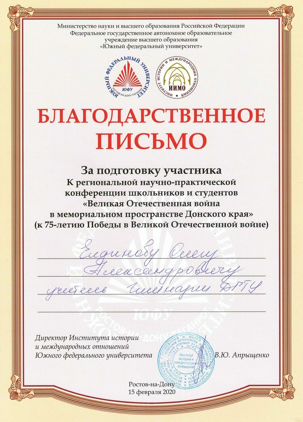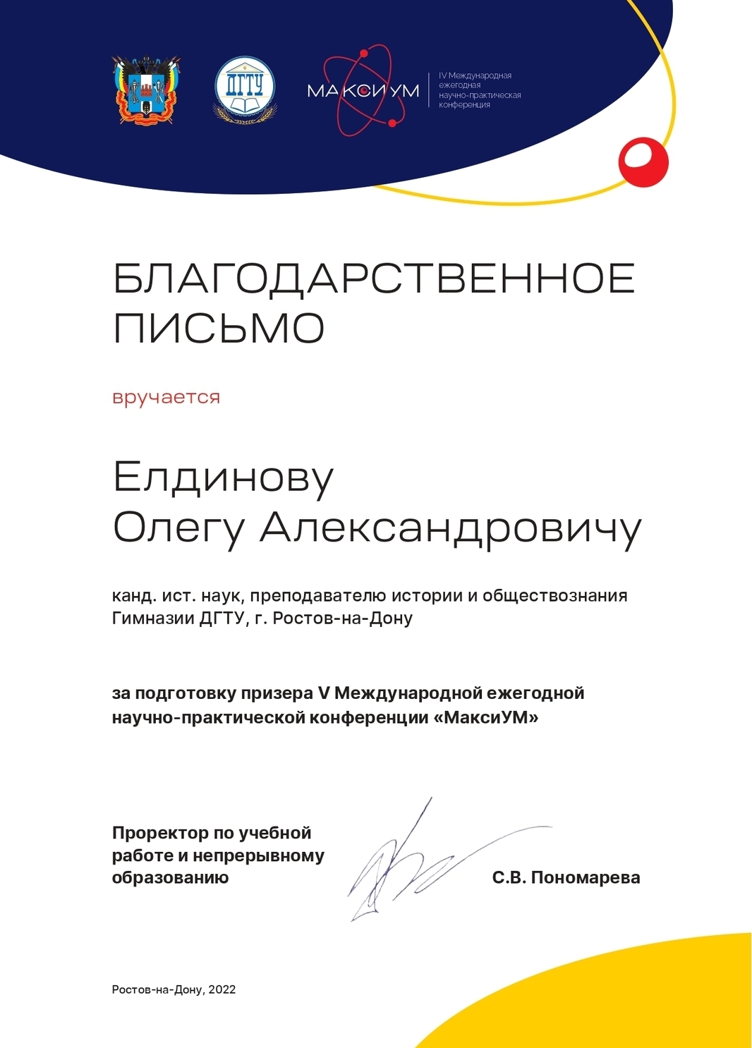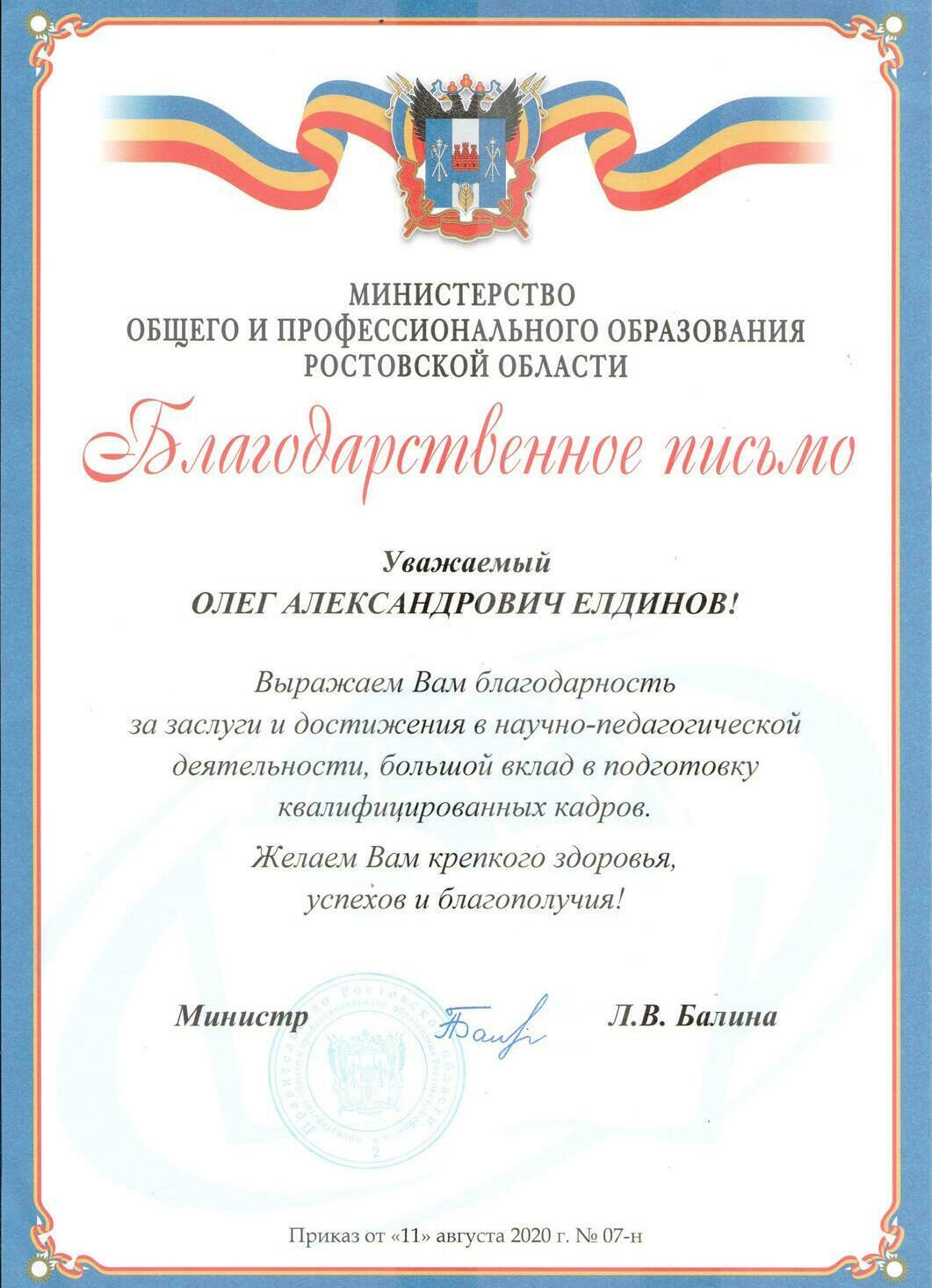 Кандидат исторических наук, приказ Министерства науки и высшего образования РФ № 1022/нк -7 от 23 октября 2019 г. Тема диссертации: «Власть и городские сообщества Ростовской области в 1985-2003 гг.: исторический опыт эволюционного взаимодействия»